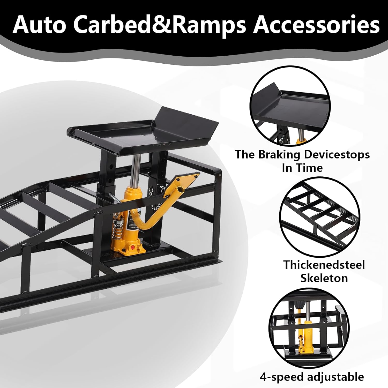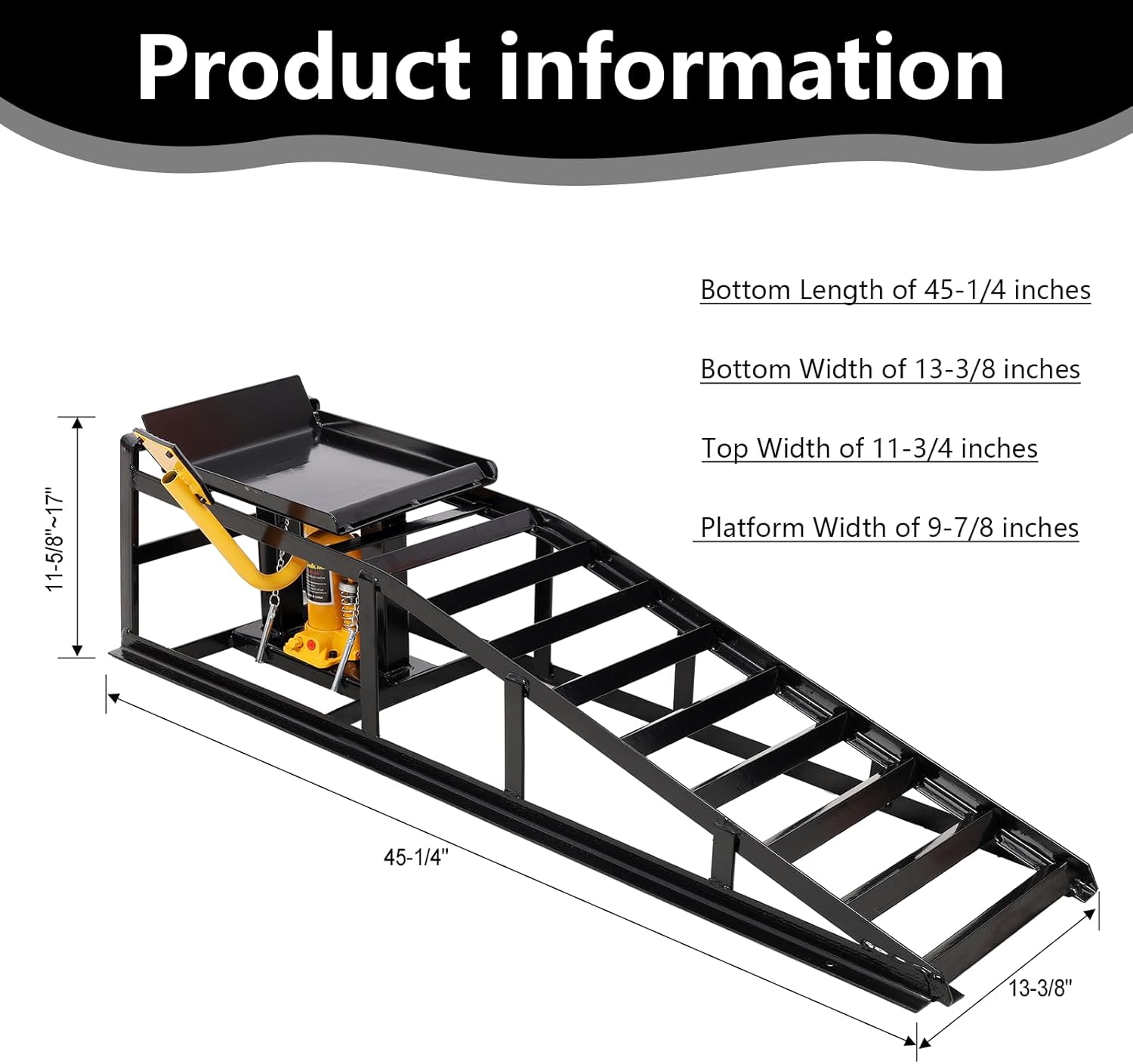Elevate Your Automotive WorkTired of struggling with standard jacks and stands that never seem to give you enough room to work comfortably? We designed the ultimate Hydraulic Service Ramps for the passionate car enthusiast and the serious mechanic who demands reliability and ease. Imagine effortlessly lifting your car or truck to a comfortable working height, giving you the space and confidence to tackle any maintenance task, from simple oil changes to more involved repairs.Engineered for Strength and PerformanceThese are not your average car ramps. Here’s a closer look at what sets them apart:Material: High-Grade Industrial SteelMaximum GVW Capacity: 10,000 lbs (5 Tons) CombinedAdjustable Lift Range: 11.63 inches to 17 inchesOverall Dimensions: 45.25" Long x 13.38" WidePlatform Width: 9.87 inchesOperation: Hydraulic Foot PedalFinish: Durable Black CoatingThe solid steel construction provides a rock-solid foundation for any vehicle, while the powerful hydraulic system makes lifting heavy loads feel nearly weightless.A Commitment to QualityWe believe that great tools should be built to last. That’s why our service ramps are engineered with meticulous attention to detail and superior materials. From the smooth-action hydraulic pump to the sturdy, welded steel frame, every component is designed for long-term performance and user confidence. We are dedicated to providing you with a tool that becomes an indispensable part of your garage for years to come.What's in The Box?Your package is delivered with everything you need to get started right away. Inside, you will find:Two Hydraulic Car & Truck Service RampsComplete Assembly HardwareAn Easy-to-Follow Instruction ManualGet ready to transform your vehicle maintenance experience with a set of ramps built for power, convenience, and durability.