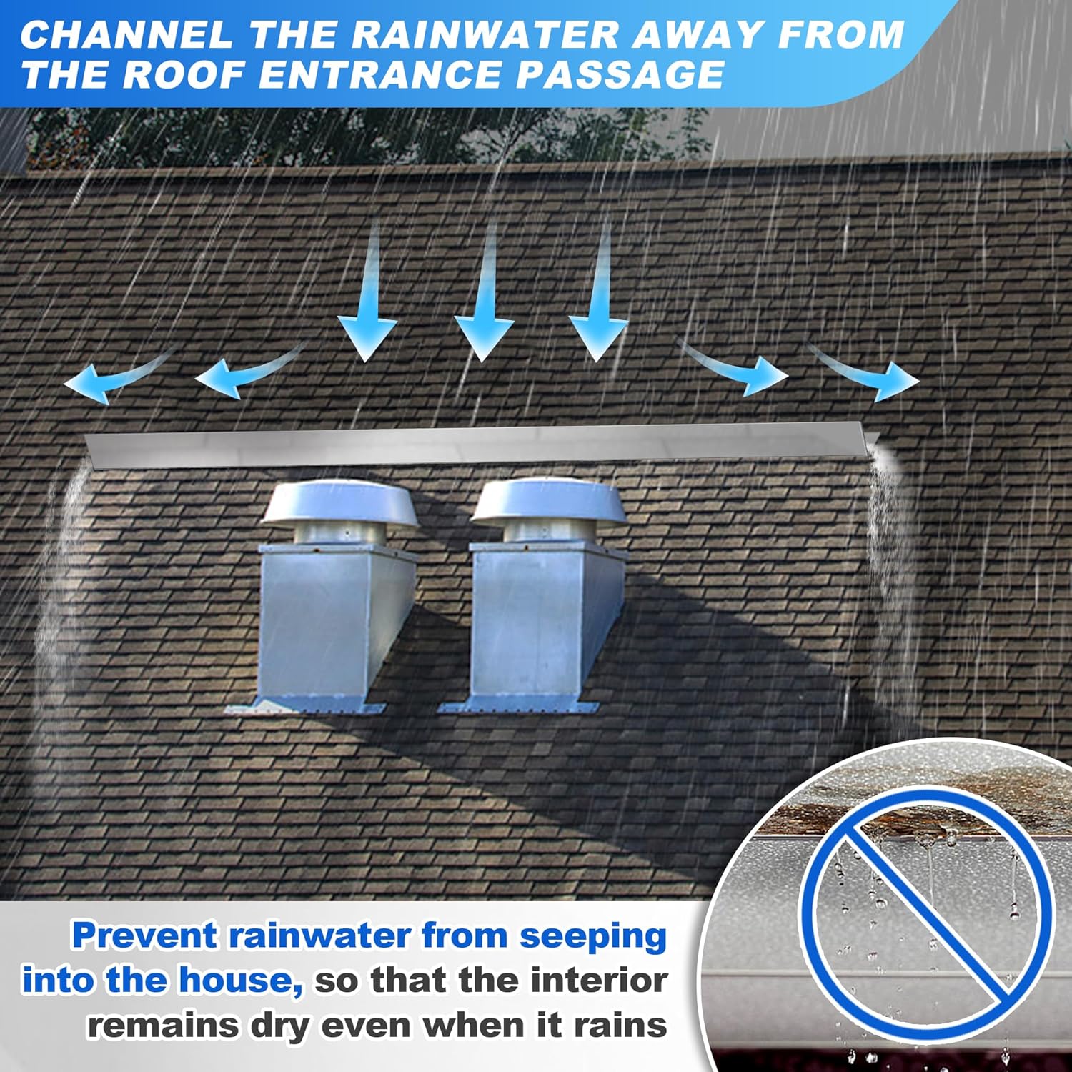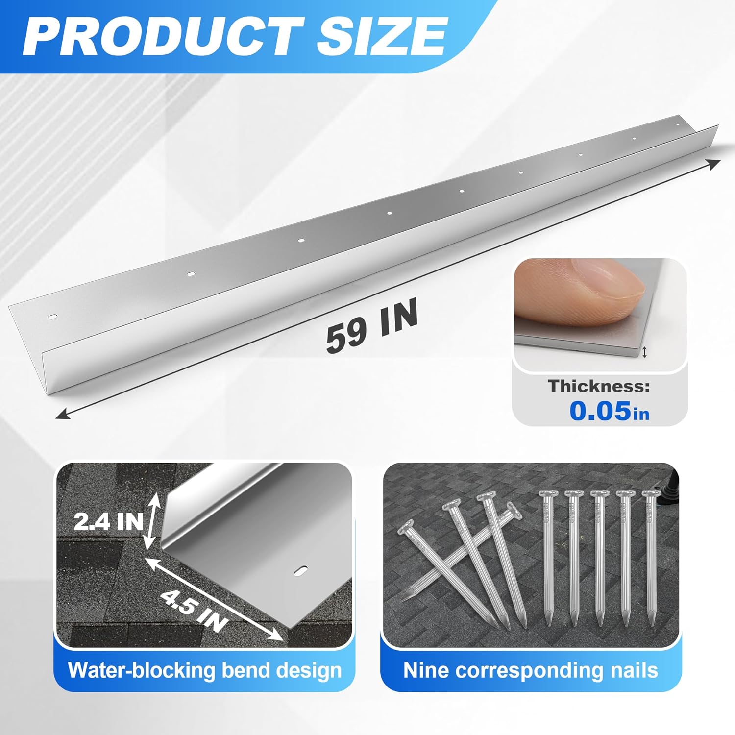This is a roof rain diverter for house, lengthened rain diverter for roof - nails included, stainless steel roof water diverter with 9 mounting holes, guide rainwater away from the roof entracne ways to prevent water seepage, 1/20" thick.