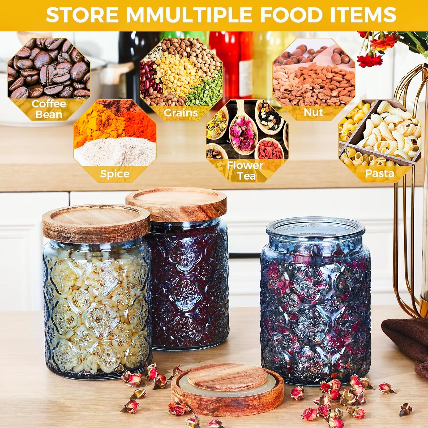 Features: Nice color & Begonia design: These blue glass jars with delicate begonia patterns add a pop of color and personality to your space. They look stunning on a coffee bar (holding whole beans), bathroom vanity (storing bath salt), or kitchen counter (displaying candy)—turning everyday storage into a decorative statement. Airtight Seal for All Contents: Whether you're storing dry kitchen ingredients or moisture-sensitive bath products, the silicone-sealed wood lid keeps everything fresh. No more worrying about your favorite loose-leaf tea absorbing kitchen odors or your bath salt turning into a hard clump—these jars protect your items while looking great. Specifications: Size: about 5.5x3.9x3.9inch/14x10x10cm Material: glass, wood Color: blue Package Included: 6 x Vintage jars Warm notes: Manual measurement, please allow slight errors in size. The color may slightly differ due to different screen displays