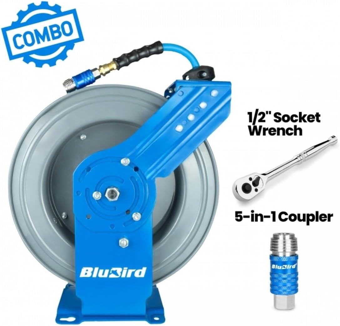 BluBird BBRDA1250-AIO Rubber Air Hose Reel 1/2" X 50(Dual Arm) w/3' Lead-in-Hose