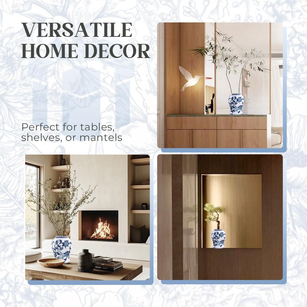 | Recommended Uses For Product | Elevate your space with this hand-painted blue and white porcelain vase. Adorned with blooming plum blossoms and golden accents, it stands as a timeless decorative piece or an elegant vessel for displaying dried flowers. |