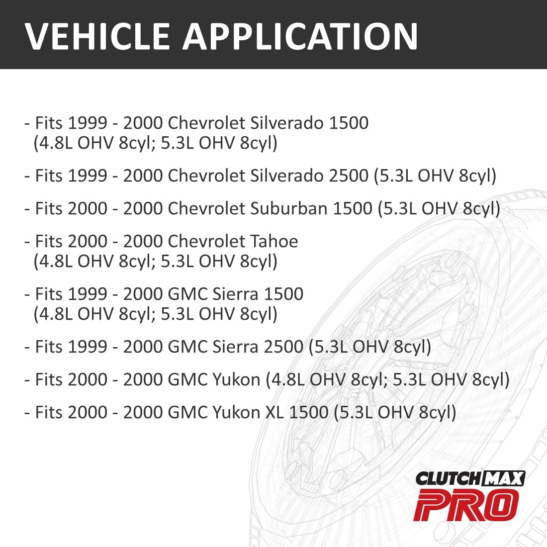 Vehicle ApplicationFits 1999 - 2000 Chevy Silverado 1500 (4.8L OHV 8cyl; 5.3L OHV 8cyl)Fits 1999 - 2000 Chevy Silverado 2500 (5.3L OHV 8cyl)Fits 2000 - 2000 Chevy Suburban 1500 (5.3L OHV 8cyl)Fits 2000 - 2000 Chevy Tahoe (4.8L OHV 8cyl; 5.3L OHV 8cyl)Fits 1999 - 2000 GMC Sierra 1500 (4.8L OHV 8cyl; 5.3L OHV 8cyl)Fits 1999 - 2000 GMC Sierra 2500 (5.3L OHV 8cyl)Fits 2000 - 2000 GMC Yukon (4.8L OHV 8cyl; 5.3L OHV 8cyl)Fits 2000 - 2000 GMC Yukon XL 1500 (5.3L OHV 8cyl)About ClutchMax PRO ClutchMax PRO® has 20+ years of history supplying very best clutch products to top tier clutch brands in Japan, UK, Australia and U.S. ClutchMax PRO® has taken this experience and a new approach to re-engineer performance clutch industry and is now one of the fastest growing performance clutch company in the world. ClutchMax PRO® contributes this growth to its commitment in the innovation and highest quality of the products that we design and manufacture, complimented by an industry leading warranty and unparalleled customer service. Compatible model and year list Please enter your Year, Make and Model above using Amazon’s ‘My Garage’ tool - the tool will specify which clutch kit fits your vehicle Questions or Concerns? If you have any questions/concerns, message us using Amazon’s ‘contact seller’ form. We respond to all messages within 24 hours.