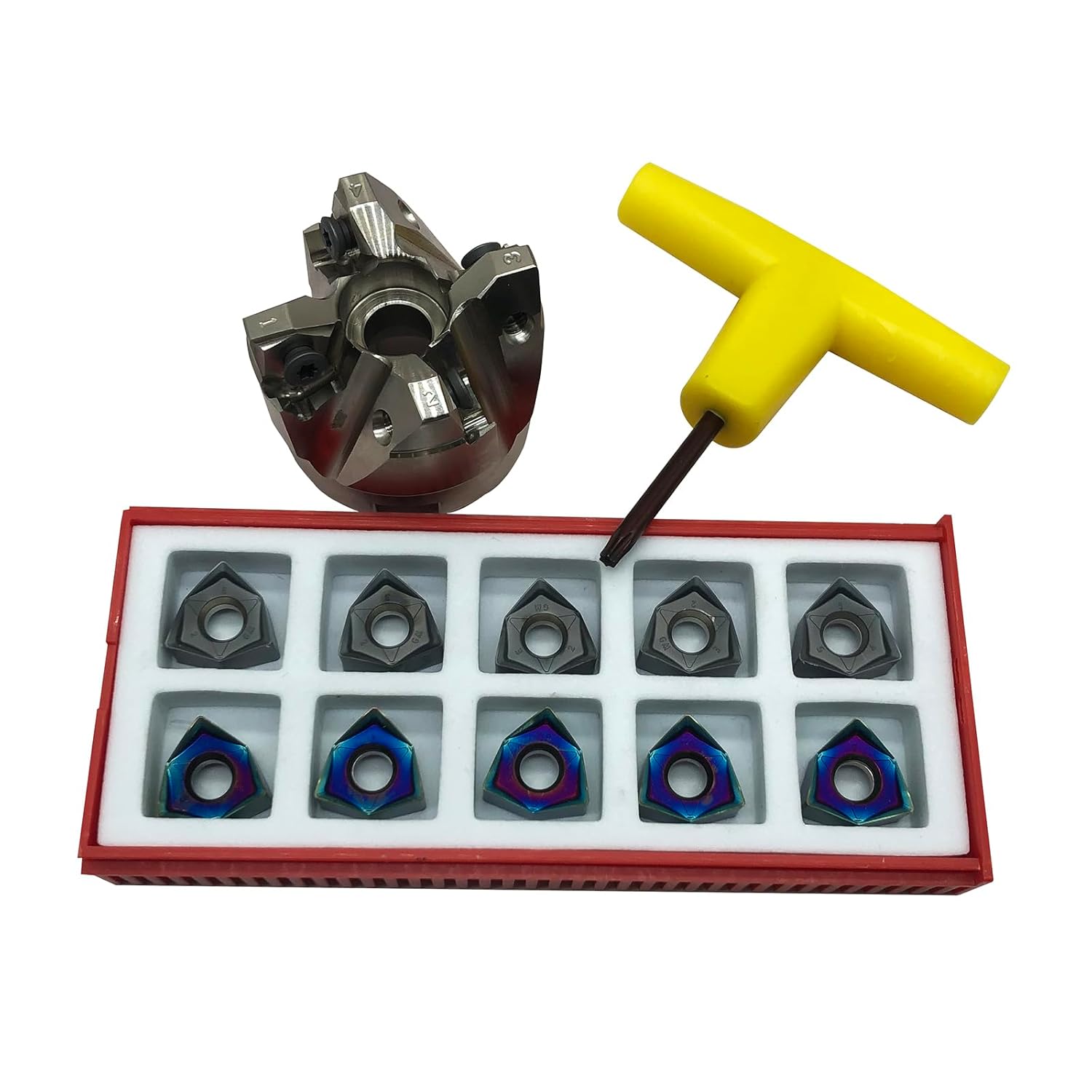 Face milling Holder: MFWN90 050R-4T, 42CrMO, 4 edges, curved design ,to increase the ability of the tooth dege collapse, high:38mm/1.5in, dia of the cutter: 50mm/1.97in, dia of the inner hole: 22mm/0.87in, adapt M5*12 screws, T20 wrench ,and WNMU08 inserts; Milling inserts: WNMU080608GM, Rough Machining Fast Feed Square milling Grain Inserts Double sided Six Corner available in use, blade length=0.33in , inner hole=0.18in, thickness=0.29in, 90degrees cutting edge angle ,replace APMT160PDER Milling inserts Carbide with TiN coating, yellow inserts for steel ,Bronze inserts for stainless steel, Color inserts for Hardened Steel, Black inserts for stainless steel ,steel and cast iron; Suitable for face milling ,should milling ,side milling ,fine machining, roughing ,slotting and copying; Package: 1 x MFWN90 050R-4T mill arbor with T20 wrench+10pcs WNMU080608 Inserts