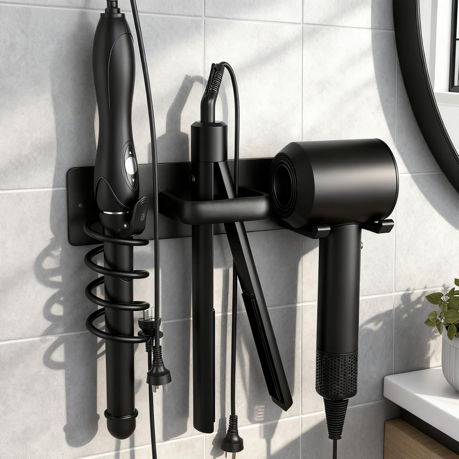 • 【Space-Saving & Organized Storage】A modern solution for neatly storing all your hair tools, this 3-in-1 curling iron holder keeps your bathroom tidy and clutter-free. With compact dimensions of 12.1" x 2.7" x 5.9", it saves space while providing easy access to your hair dryer, curling iron, and straightener, maintaining a clean and orderly environment.
