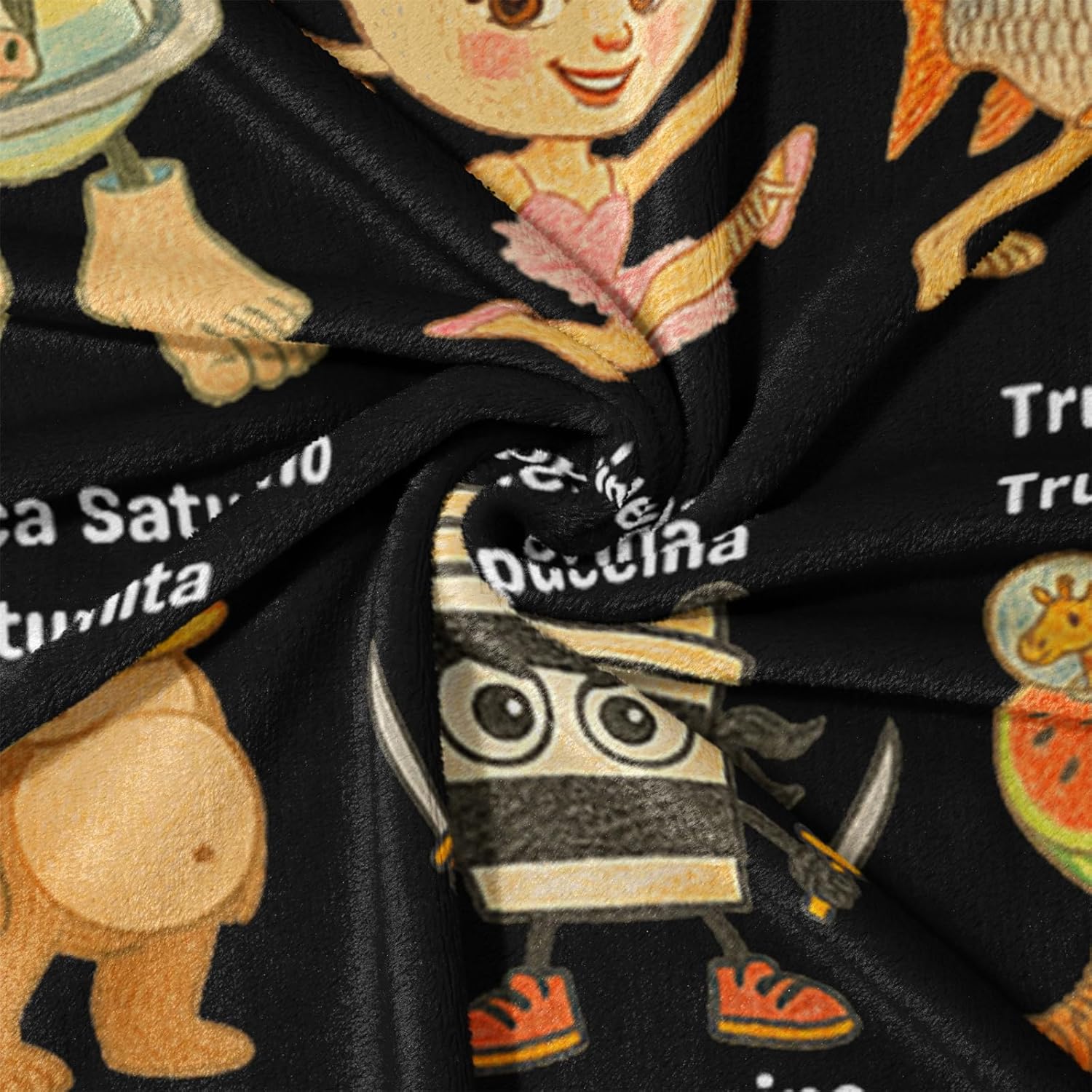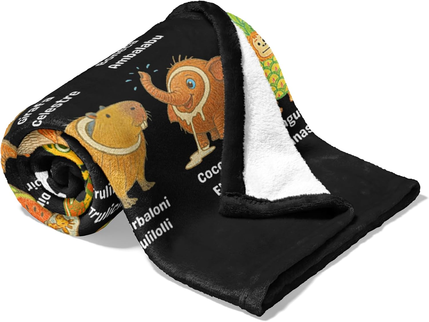 Dive into the whimsical world of Italian Brainrot characters with this delightfully quirky throw blanket! Featuring an entertaining collection of 20 uniquely designed characters on a sleek black background, this 60" x 50" blanket showcases fun personalities like Tung Tung Tung Sahur, Chimpanzini Bananini, and the playful Bombardiro Crocodilo. Each character comes with its charming Italian-style name, making this blanket both decorative and conversation-starting. The blanket combines a soft, cozy white interior with a durable black exterior, perfect for staying warm while enjoying its artistic design. Whether draped over your couch, used as a lap blanket during movie nights, or added to your bedroom decor, this Jschlatt character blanket brings both warmth and personality to any space. The generous size makes it ideal for individual use, while the quality construction ensures it stands up to regular use. The perfect gift for animation enthusiasts or anyone who appreciates unique, character-driven design.