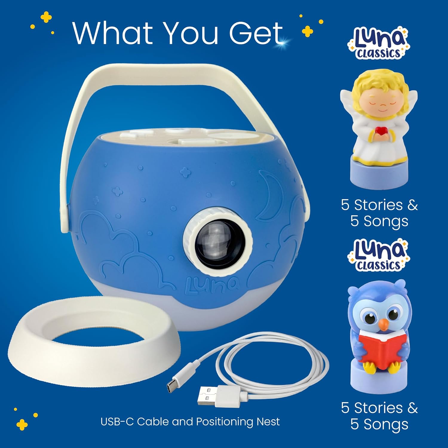 The Luna Story Time Book Projector turns bedtime into a fun and screen-free storytelling experience. With over 30 minutes of audio narration, songs, and bright projected images, it helps kids wind down while building early literacy skills. It includes 5 classic read-aloud stories like Little Red Riding Hood and Goldilocks, along with 5 familiar songs and more than 750 beautiful images that project up to 8 feet—20 times more visuals than other options. A soft-glow nightlight and 15 minutes of soothing music help create a calming bedtime routine, with an auto shut-off feature for peace of mind. Designed for small hands, it's easy for kids to use on their own or with a parent—just place the character on top and press a button. Luna works wirelessly with batteries (not included) or can be plugged in via USB. You can also expand the fun with additional Luna characters and story sets like PAW Patrol, Daniel Tiger, and Sesame Street, sold separately. Luna grows with your child and makes a great gift for ages 3 and up. Kids Video Projector Toy - Bedroom Starlight, Fun Learning. Interactive Kids Projector for Walls & Ceiling. Gift for kids.