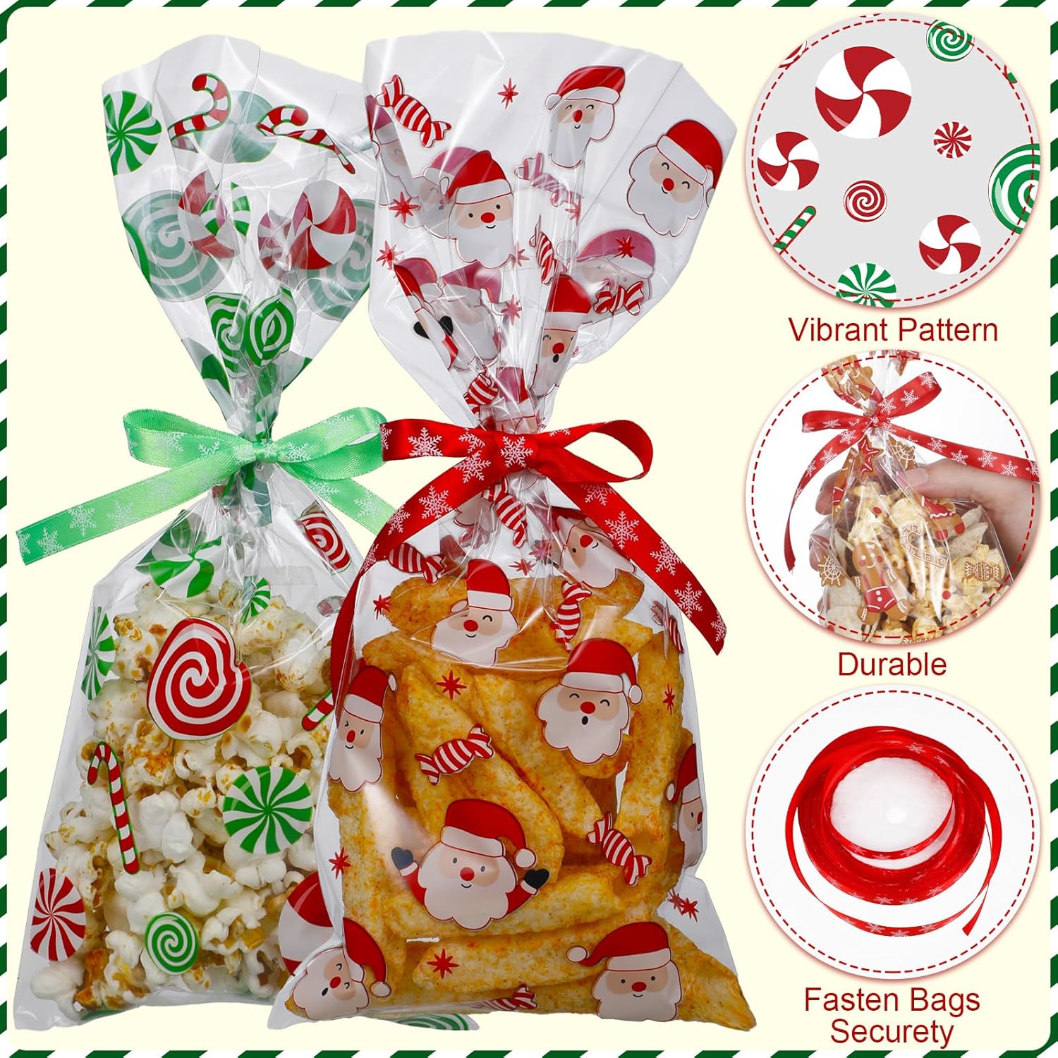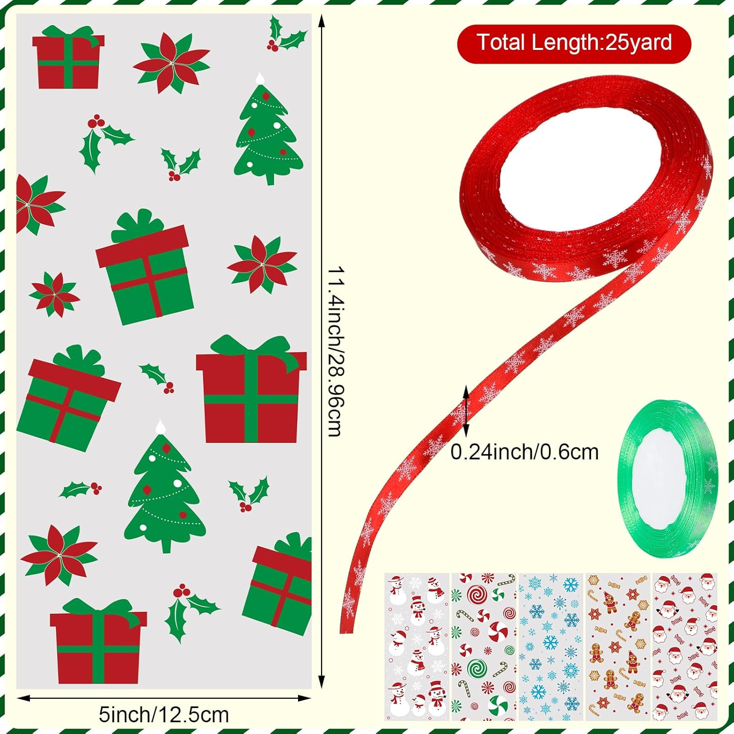 Layhit 600 Pcs Christmas Cookie Bags Christmas Snack Bag with 50 yd Ribbon Cellophane Gift Bags for Xmas Goodie Arts Crafts Flower Wrapping Party Favor Supplies