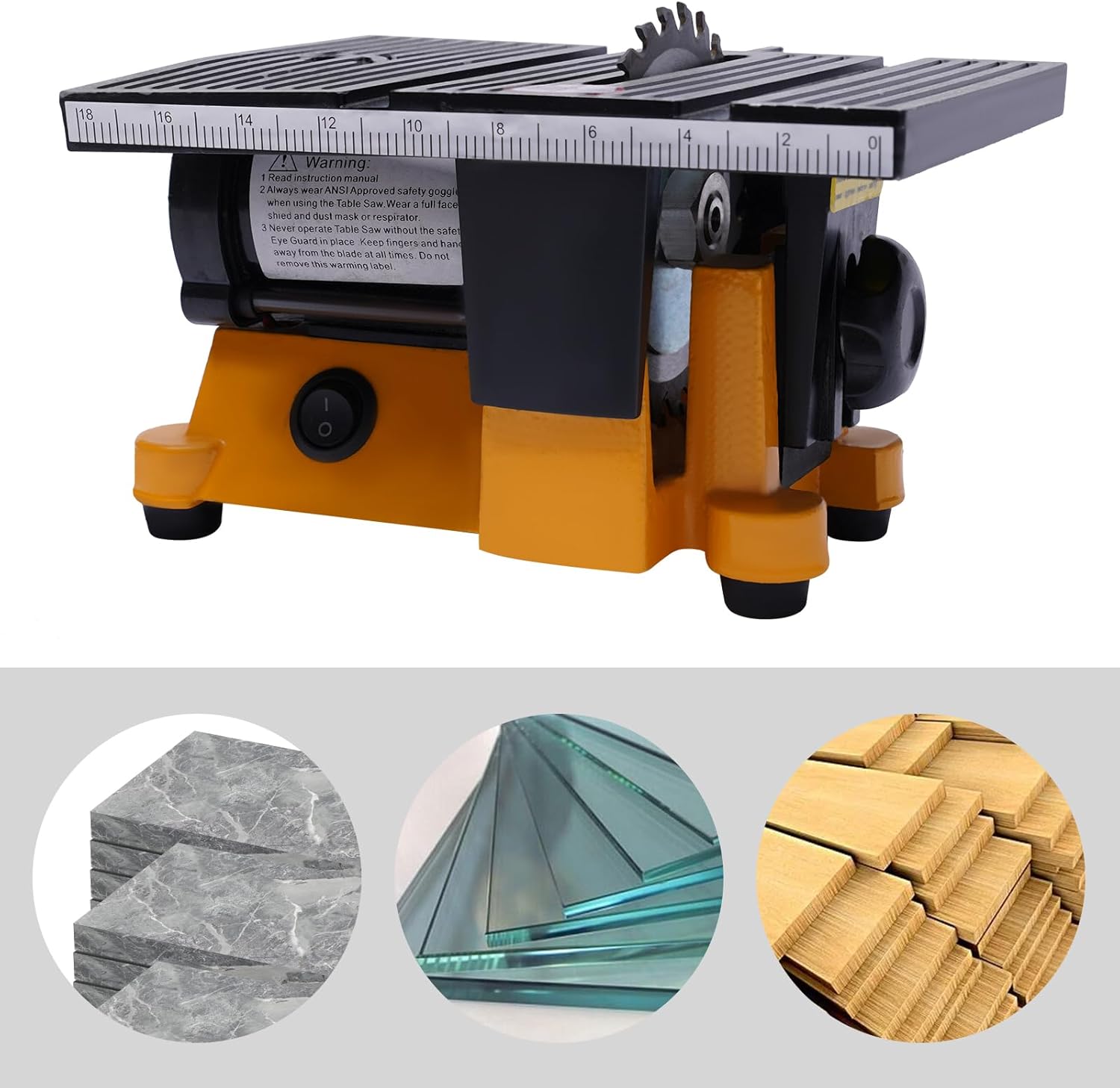DescriptionThe traditional method of manual cutting is often seen as both time-consuming and hazardous. But with the introduction of our table saw, such worries are unfounded. Crafted with premium materials, a robust motor, and three different blades, our table saw is a precision-engineered product designed to optimize cutting efficiency and meet a variety of material-specific needs. It is the ideal assistant for any trade or craftsperson in search of an efficient, reliable, and versatile cutting tool.DetailsRaised Feet: The raised rubber feet ensure stability when the product is in use and make it easy for you to clean.Adjustment Knob: You can change the saw blade quickly with it, which is convenient and time-saving.Protective Cover: It can be attached to the saw blade, eliminating the risk of accidental contact and increasing safety.Scale: Precision scales on the side and stripes on the work table make your cutting work more precise.ApplicationIt can be used in industry, furniture industry, wood processing plants, etc. It can cut non-metallic materials such as plastic, wood, glass, stone, plywood, OSB sheet, acrylic, PVC pipe, gypsum board and non-ferrous materials such as copper and aluminum.SpecificationsColor: Yellow+BlackMaterial: Aluminum Alloy, Pig Iron and RubberMounting Type: Floor StandingAssembly Required: YesMotor Type: DC MotorPower: 90WHorse Force: 1/8HPVoltage: 110V, 60Hz, 0.9AMPSSpeed: 4500RPMPlug Type: US StandardPower Source: Corded ElectricNumber of Items: 1Depth of Cut: 1.6cm / 5/8"Table Size: 190*142mm/7.48*5.59inSaw Blade Diameter: 10cm/4"Arbor Diameter: 12mm/0.47"Non-metallic Cutting Depth: 15mm/0.59inCutting Depth for Soft Metals: 13mm/0.512inCutting Depth for Hard Metals: 4mm/0.157inProduct Size: Approx. 190*142*116mm/7.48*5.59*4.57inPackage Included1* Table Saw3* Blades(One is Installed)1* Protective Cover1* Miter Guide1* English ManualAll Accessories for InstallationNotes1. Please read the operating manual completely before use. And pay particular attention to the safety instructions included.2. Please make sure the screw has been tightened before using!3. Please always wear ANSI-approved safety goggles(not included) when using the item. Please wear a full-face shield and a dust mask or respirator(not included). 4. Please keep fingers and hands away from the blade at all times and please do not remove the warning label.5. Please allow the slight color difference caused by the shooting light and 1-3cm error due to manual measurement, and make sure you do not mind before ordering.