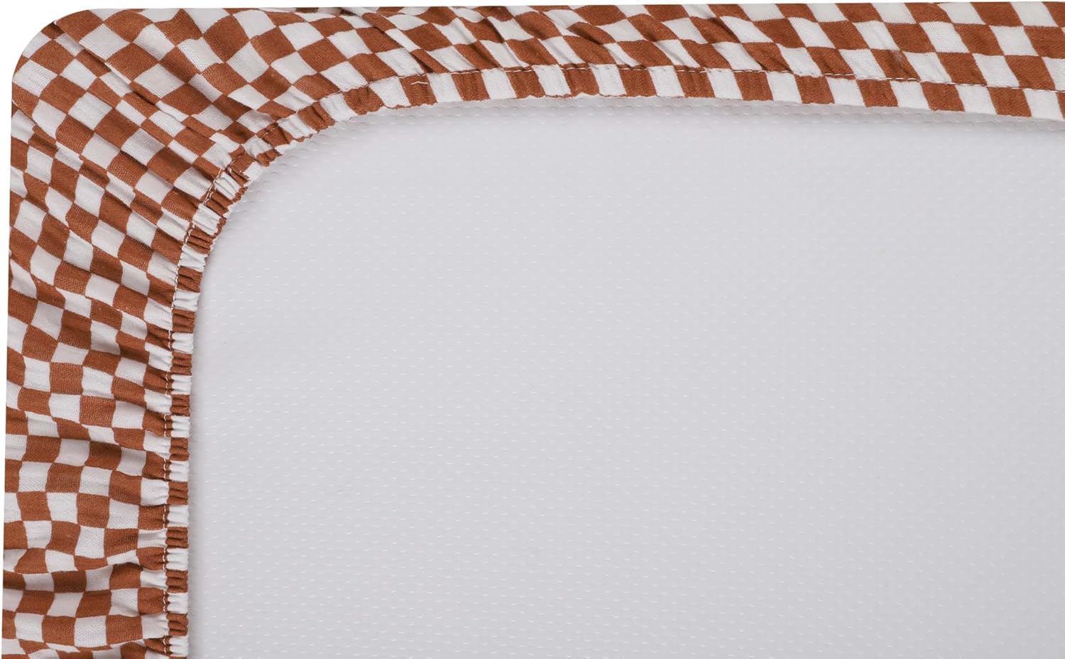 Premium Muslin Mini Crib Sheets by Onacosht - 39" x 27" x 5" Ultra soft muslin pack n play sheets for your baby's perfect rest. Our muslin fitted mini crib sheets are made of premium 100% cotton muslin, lightweight and breathable. At 39 inches by 27 inches with 5 inch deep pockets, these sheets are designed to securely fit pack n play mattress, playard mattress and mini crib mattresses and pad.Muslin cotton is ideal for baby bedding. Its open weave allows for optimal airflow so your baby stays cozy in any weather. The soft, lightweight feel provides a breathable barrier between baby and mattress. Muslin cotton sheets are gentle on sensitive skin, and tightly-woven construction ensures baby's safety. Secure fit Our extra deep 5-inch pockets and full elastic edge provide a snug, wrinkle-free fit on most mini crib mattress, pack n play mattress and playard mattress. Sheet will stay securely in place all night without bunching or coming undone.Adorable unisex prints Sweet prints for boys and girls. It matches muslin crib blankets, swaddles and other accessories available. Easy care Machine wash warm and tumble dry low. Avoid bleach.For best fit, wash before first use. Multiple washes will soften sheet even more.Our muslin playard fitted sheets provide the ultimate in natural comfort for peaceful sleep. let them dream the night away wrapped in our muslin cotton fabric.