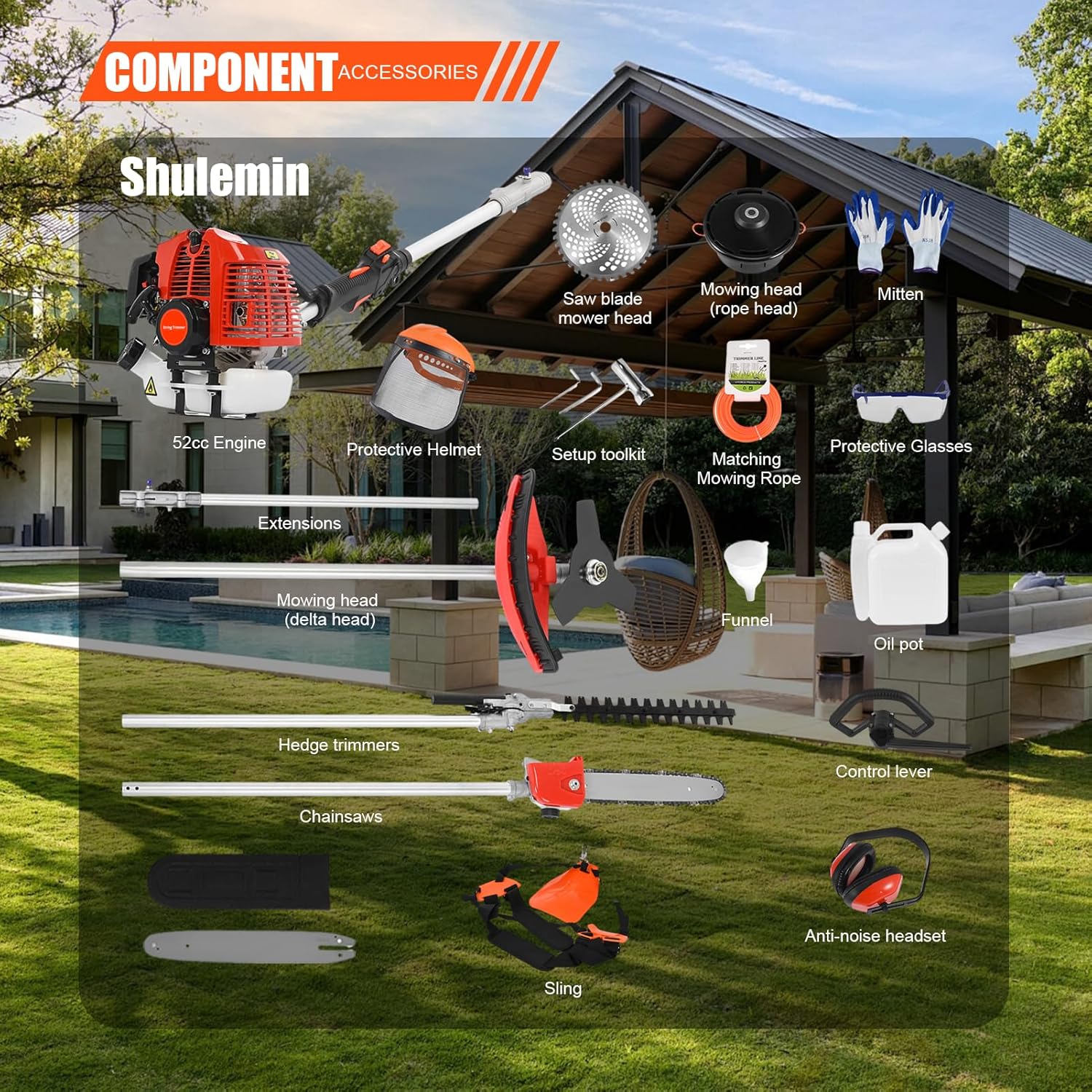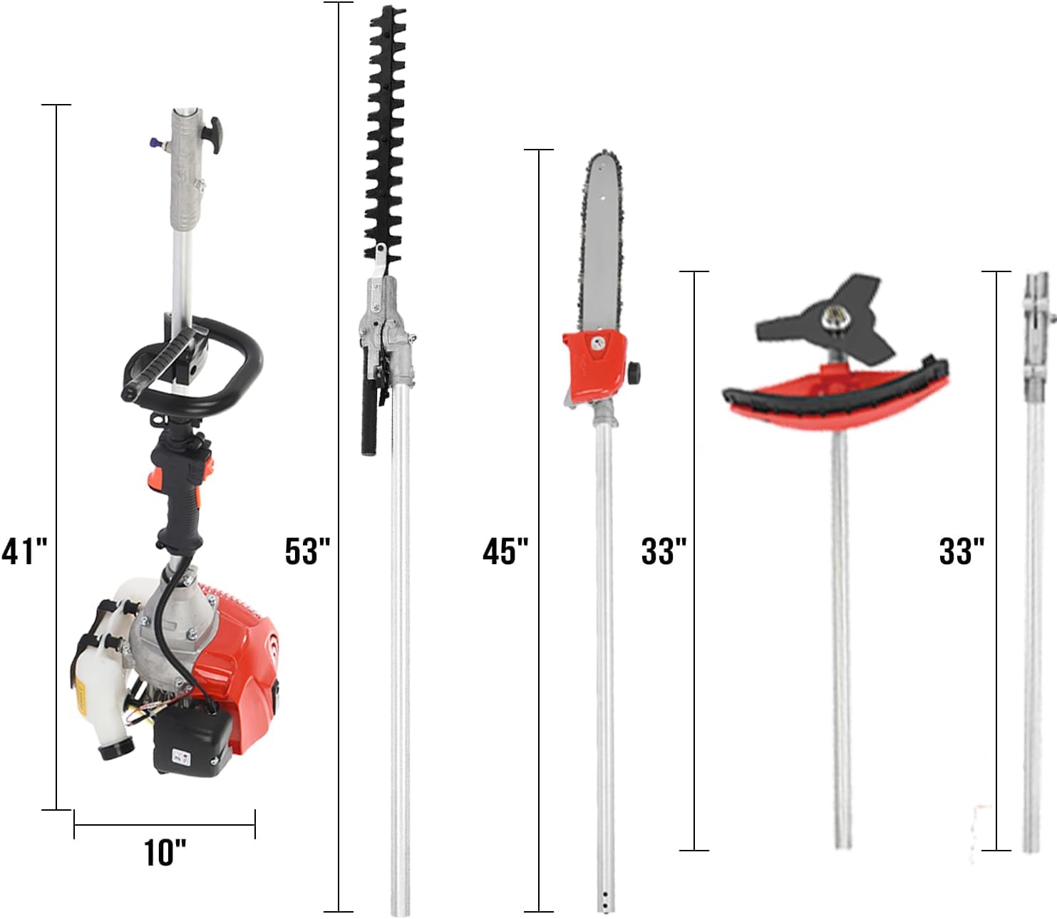| Included Components | 1 x 52CC Engine 1 x Control Rod 1 x Extension Rod 1 x Hedge Trimmer Pole 1 x Chainsaw Pole 1 x Brush Cutter Pole 1 x Oil Jug 1 x Funnel 1 Pair of Goggles 1 x Earphone 1 Pair of Gloves 1 x 40-tooth Blade 1 x Plastic Mowing Head 1 x Nylon Rope 1 x Helmet 1 x Installation Kit 1 x User Manual |