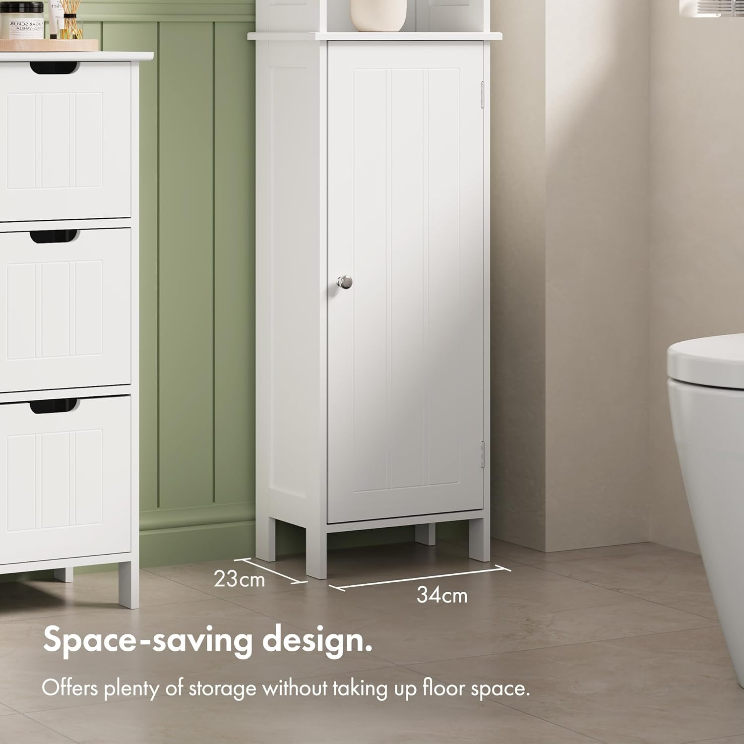 Add a touch of colonial style to your decor with this wonderful and practical bathroom cabinet. If you want to optimize the available space, you will need to make the most of every single centimeter.This colonial style cabinet from VonHaus has a compact design, but is able to accommodate a lot of bathroom essentials, due to its high structure. Made from durable MDF and finished with soft white paint, it's the perfect solution to lack of enough bathroom space. Slightly higher than 165 cm, the cabinet evokes the traditional charm of colonial style.The cabinet consists of 2 elements: a wall cabinet and a series of open shelves.In addition, find a seat belt to secure the unit to the wall to prevent it from tipping over. The cabinet includes adjustable shelves and is ideal for cleaning products, bath products and towels.Open shelves lend themselves to display items such as bath oils and perfumes, as well as neatly folded towels and decorative items. The groove and tongue effect creates a classic atmosphere, making it easy to assemble in both traditional and contemporary interiors.The paint is water resistant and the furniture can be wiped clean with a damp cloth. The unit is part of a series of colonial style furniture from VonHaus, designed to create a stylish ambience.Some parts are required. Dimensions: 165 x 34 x 23 cm.